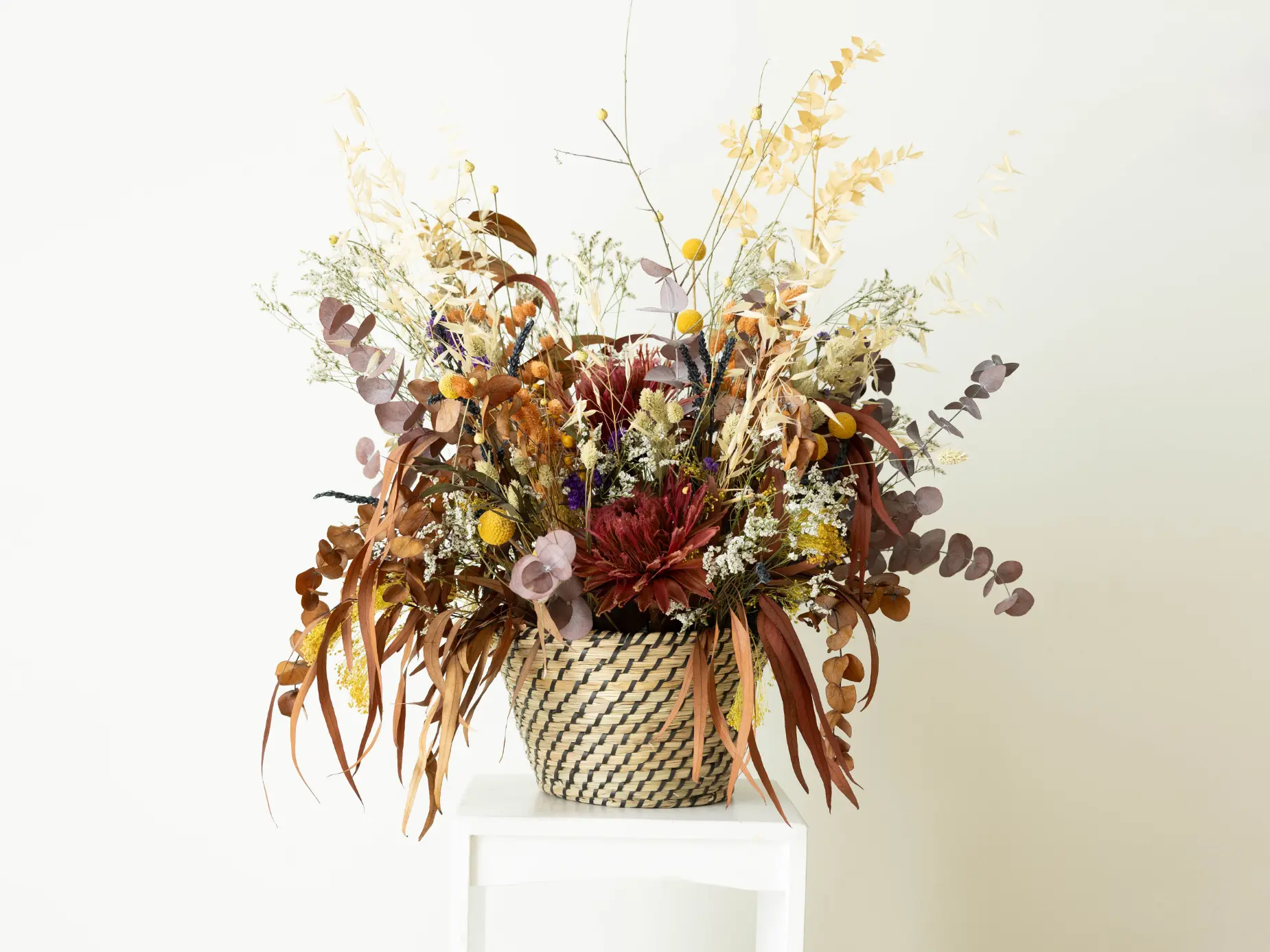 Cesta mimbre negro con flores secas en tonos alegres