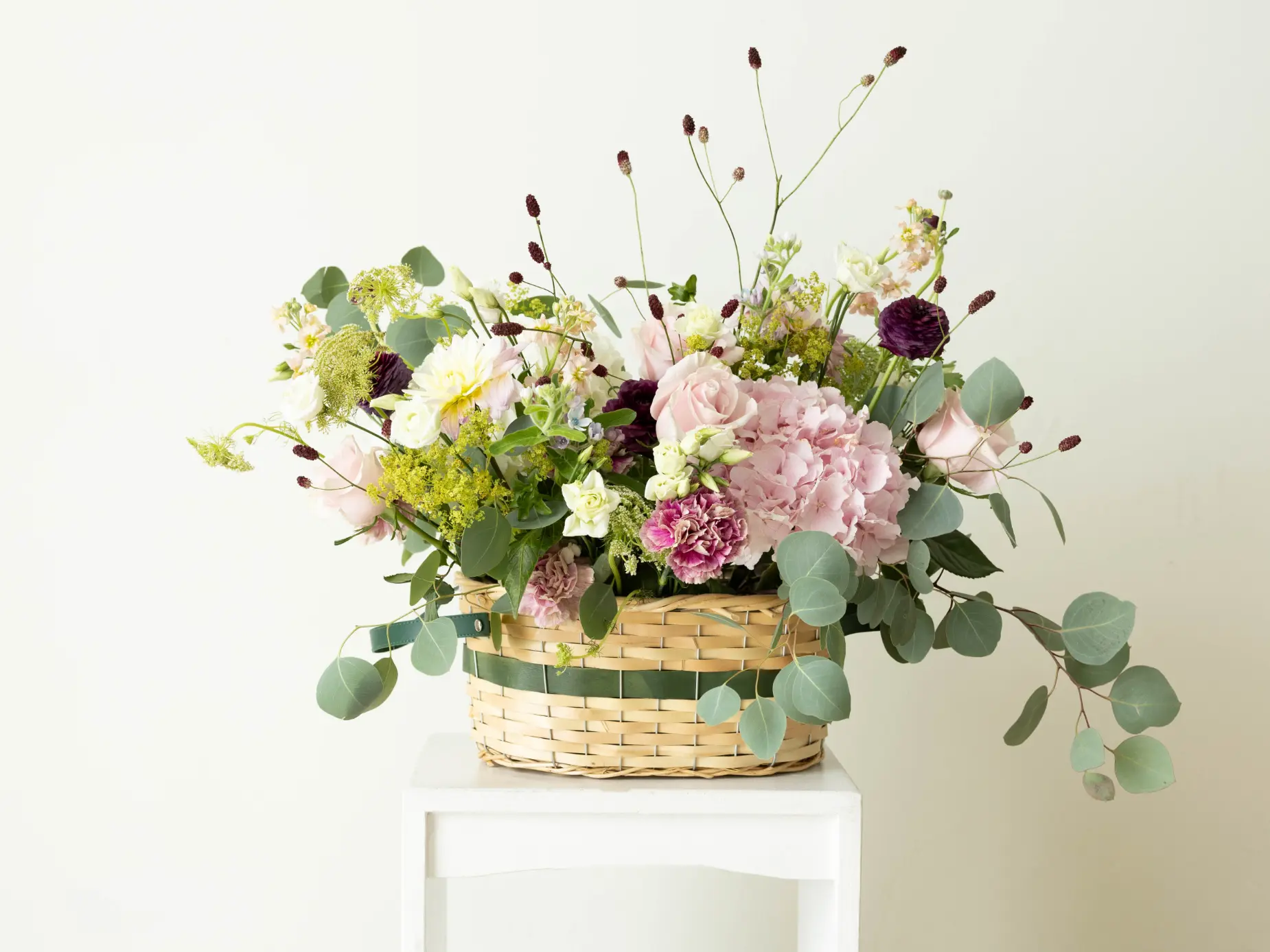 Cesta de mimbre con flores en tonos rosados, las flores son orientativas, según disponibilidad (FOTO ES M)