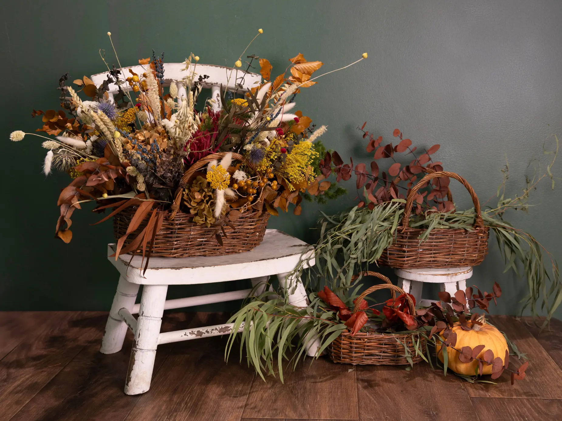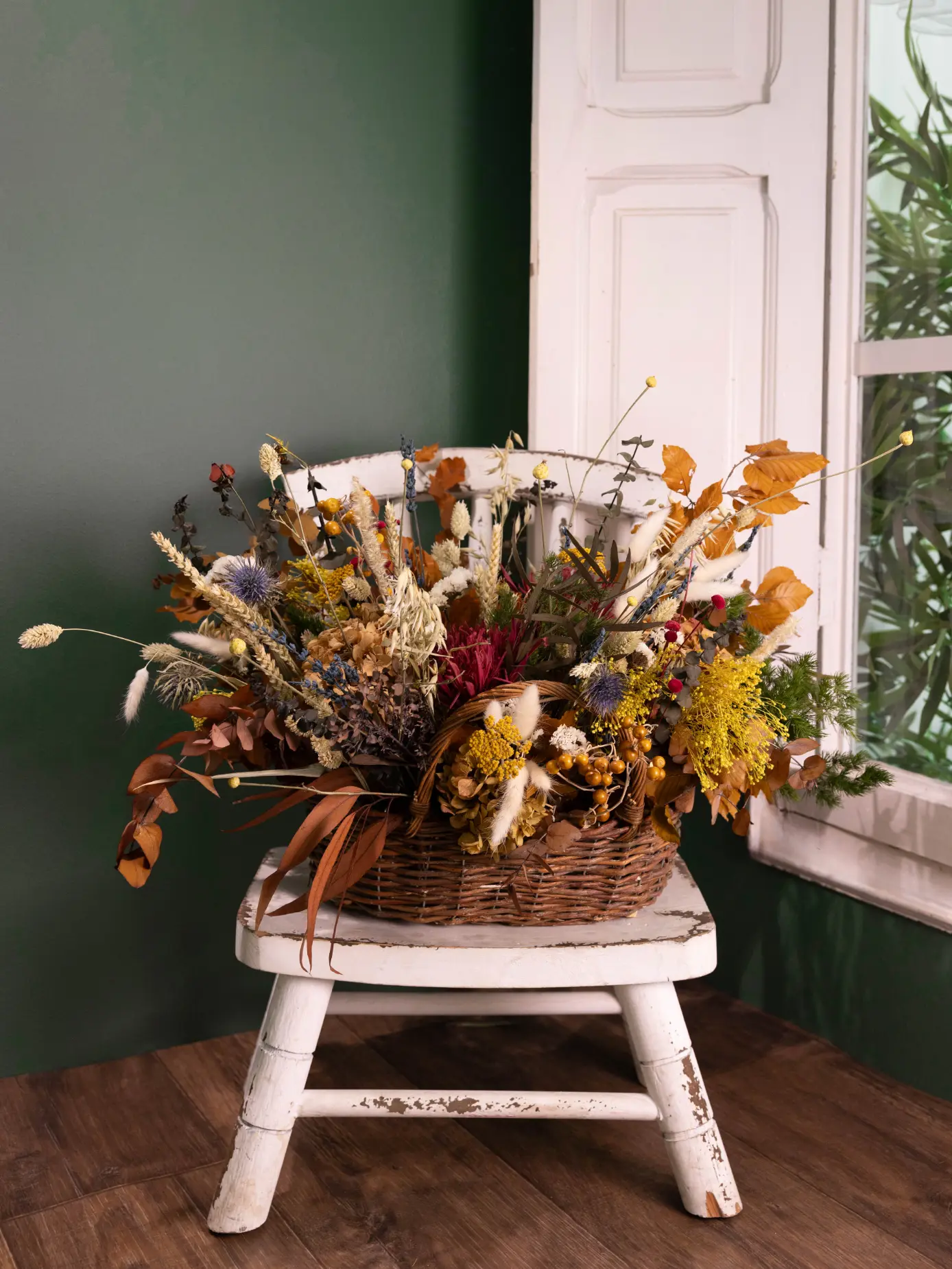 Cesta rustica con asas con flores secas en tonos otoñales (FOTO TAMAÑO L)